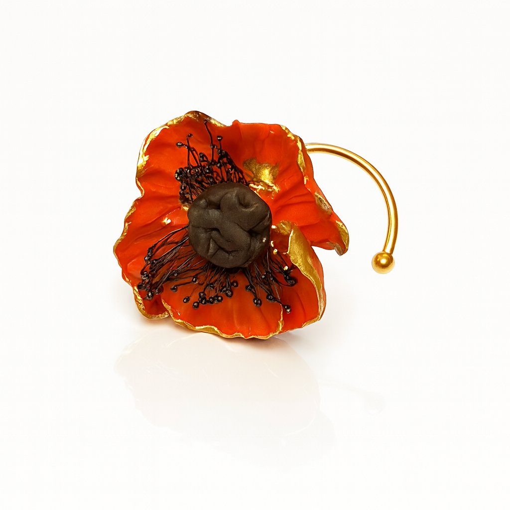 Flor libre y salvaje, símbolo de vitalidad. Anillo ajustable de acero con baño de oro y pieza de porcelana rusa inspirada en la amapola.