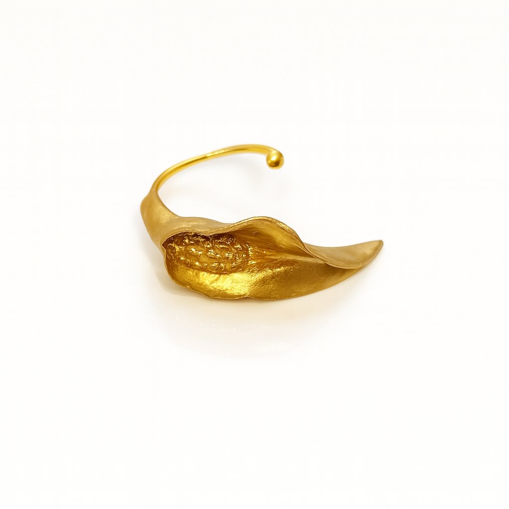 Brillo solar y calidez eterna. Anillo ajustable de acero con baño de oro y pieza de porcelana rusa dorada, moldeada a mano.