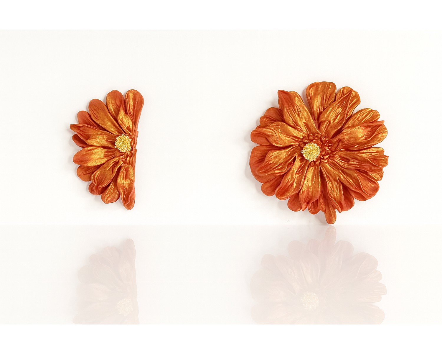 Flor de pétalos moldeados a mano con centro dorado. Base metálica con baño de oro y cierre de tuerca. Cada pétalo es una obra de arte única.