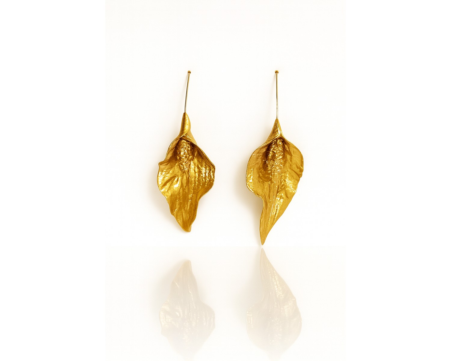 Luz y metal fundidos en una flor eterna. Pétalos de porcelana rusa bañados en tono dorado, moldeados a mano, sobre colgante curvo metálico con baño de oro.